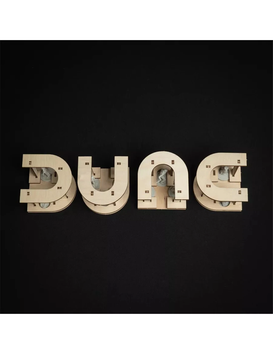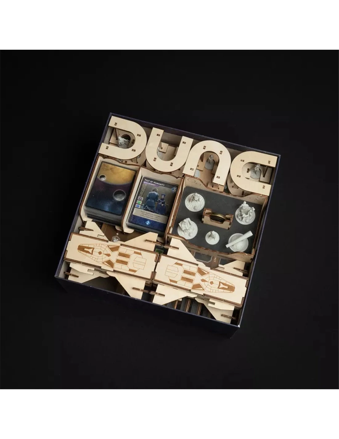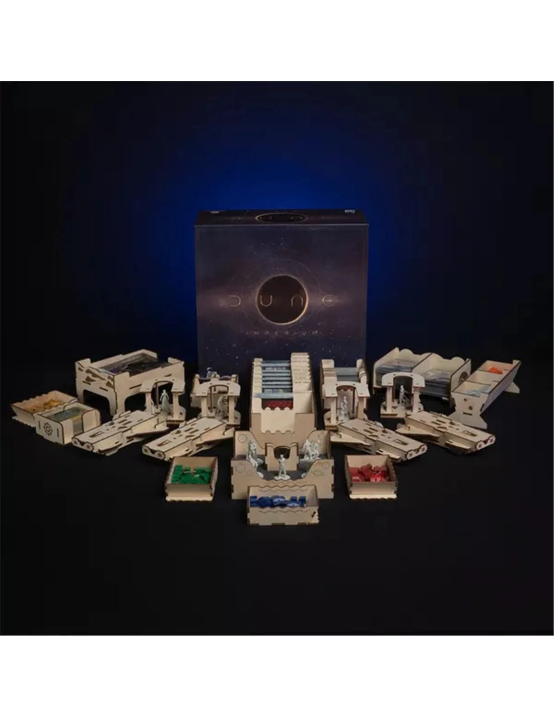 We have designed a Deluxe Organizer for the deluxe components of Dune:Imperium. With the D, U, N and E-shaped miniature holders and the spaceship boxes for player components you can immerse yourself even deeper in the Dune Universe.
