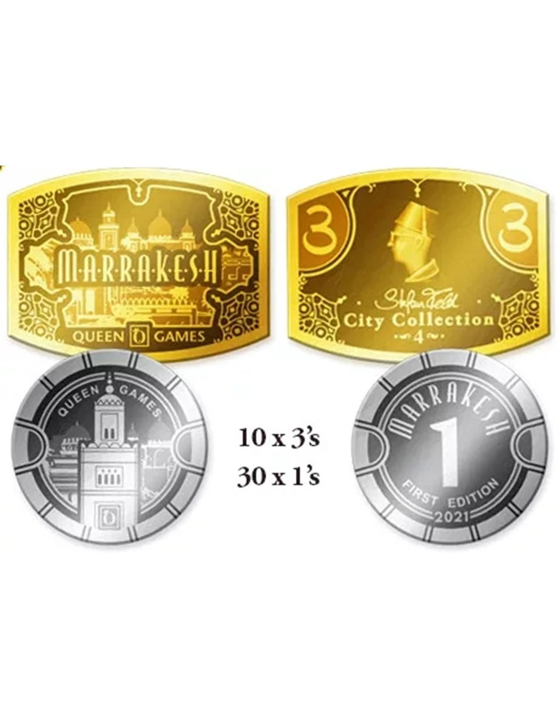 A set of metal coins designed specifically for Marrakesh. The coins feature the face of designer Stefan Feld, the game name and the building featured on the side of the game box.