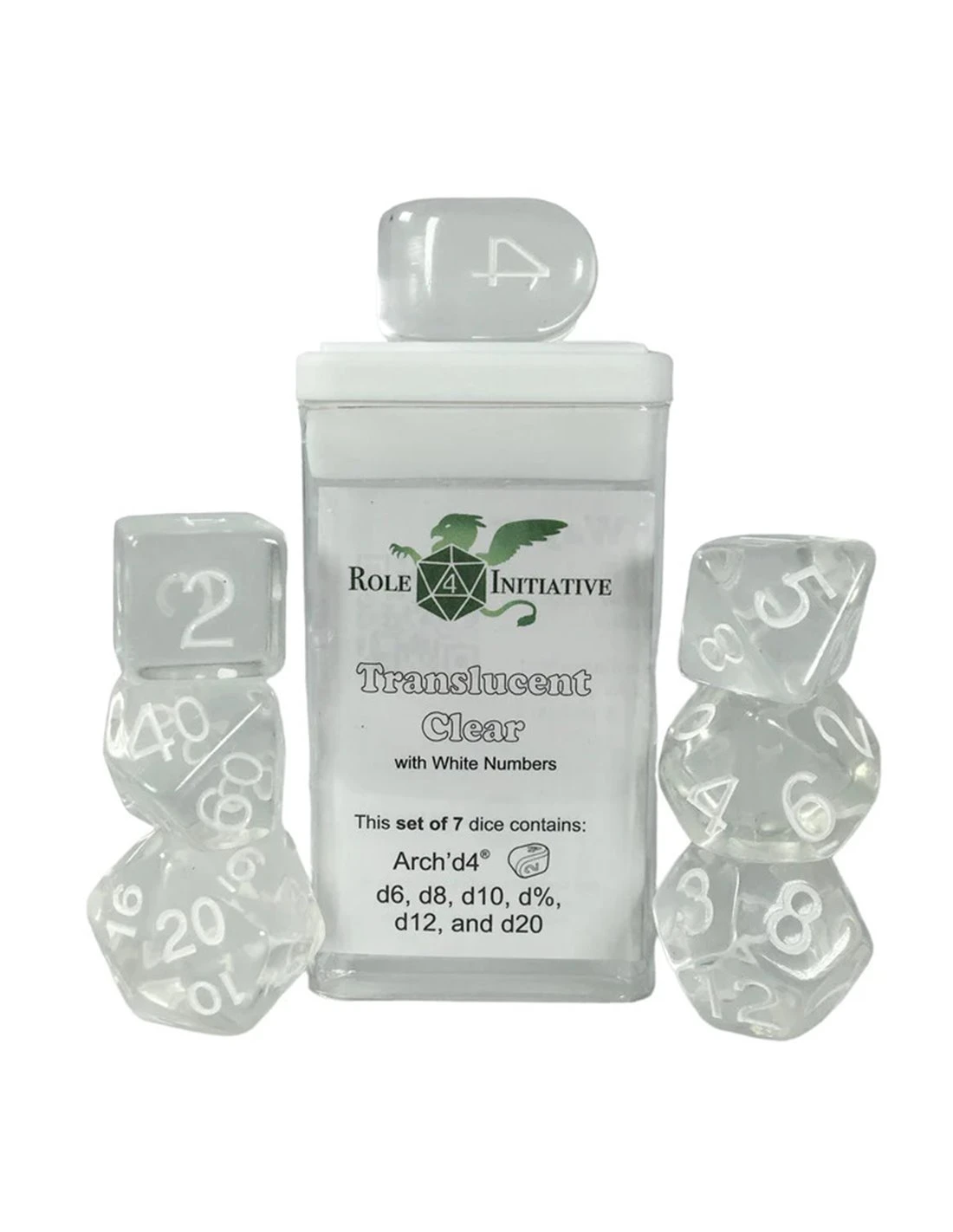Polyhydral Diceset – 7 Dice: Translucent Clear With White Numbers
